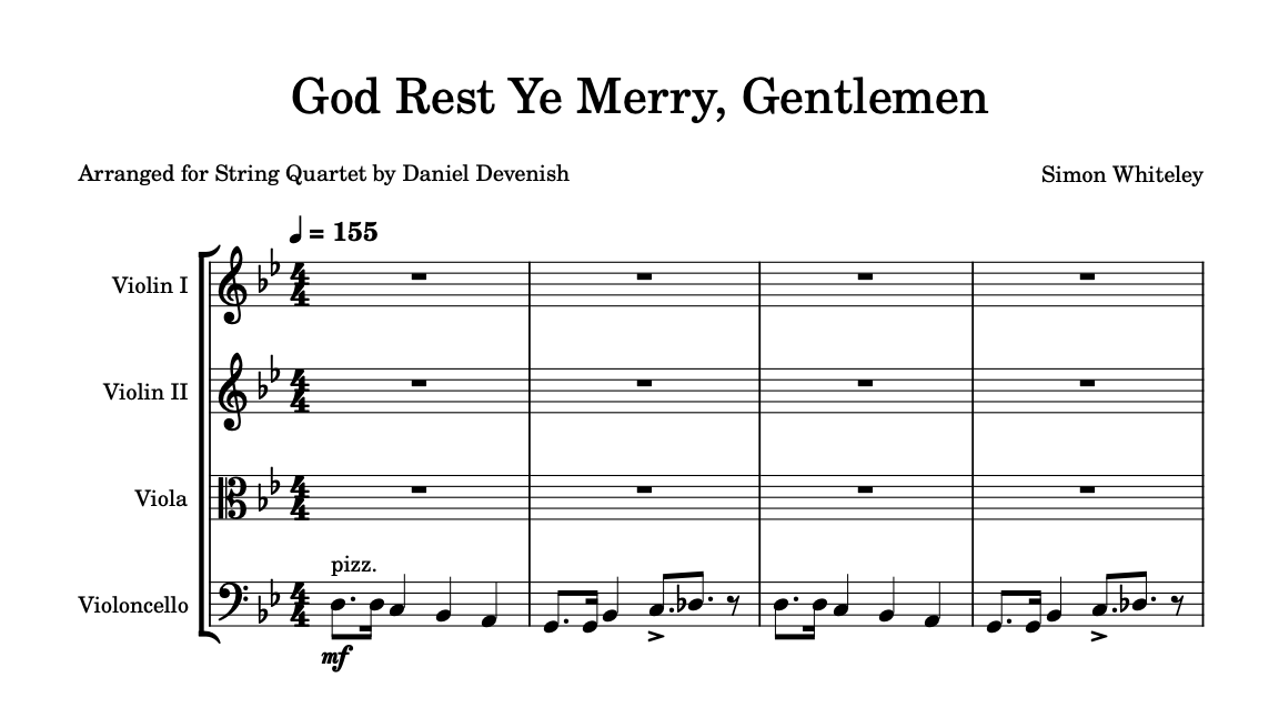 Last year I took a jazzy arrangement of God Rest Ye Merry, Gentlemen by Simon Whiteley and transcribed it by ear, rearranging the 4 vocal parts to a standard string quartet violin violin viola cello.